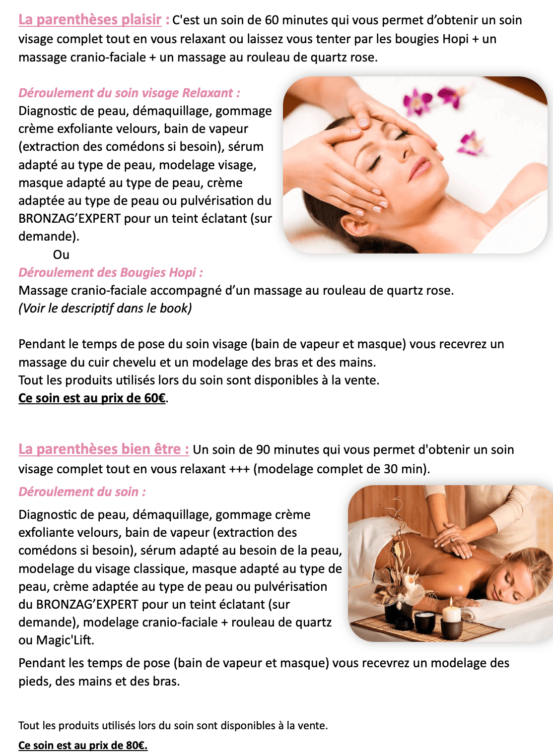 | Plaisir 60 min | Démaquillage, gommage, vapeur (modelage crâne) comédon si besoin, serum, modelage, masque pureté ou confort ou acte 3 (modelage mains+bras),crème de jour OU Démaquillage, modelage Cranio faciale + rouleau de quartz + bougie HOPI | Démaquillage, gommage, vapeur (modelage crâne), comédons si besoin, modelage, modelage synergie essentielle, masque argile, crème de jour OU Démaquillage, modelage Cranio faciale + rouleau de quartz + bougie HOPI | Démaquillage, gommage, vapeur, comédons si besoin, masque peel off ou tissu acte 3, modelage synergie essentielle OU Démaquillage, modelage Cranio faciale + bougie HOPI |