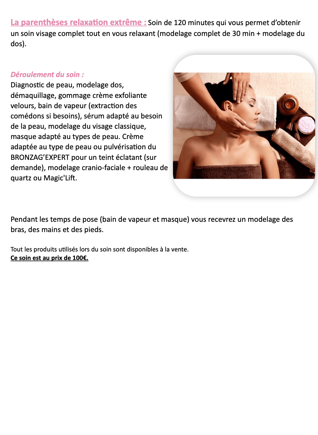 | Relaxation Extrême 120 min | Idem soin visage bien être + modelages dos, mains+ pied Choix entre le Magic’Lift OU le modelage cranio faciale | Idem soin visage bien être + modelages dos, mains + pied Choix entre le Magic’Lift OU le modelage cranio faciale | Idem soin visage bien être + modelages dos, mains + pied Choix entre le Magic’Lift OU le modelage cranio faciale |