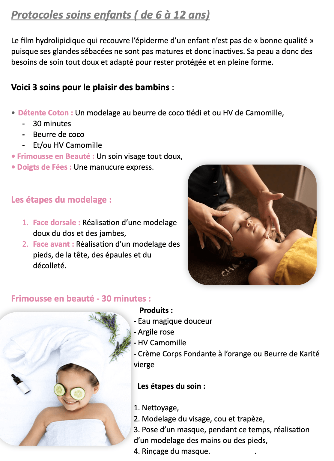 | Bien-être 90 min | Idem avec temps de modelage ++++ (Modelage pieds) + Modelage cranio faciale OU Magic’Lift | Idem avec temps de modelage ++++ (Modelage pieds) + Modelage cranio faciale OU Magic’Lift | Idem avec temps de modelage ++++ (Modelage pieds) + Modelage cranio faciale OU Magic’Lift |