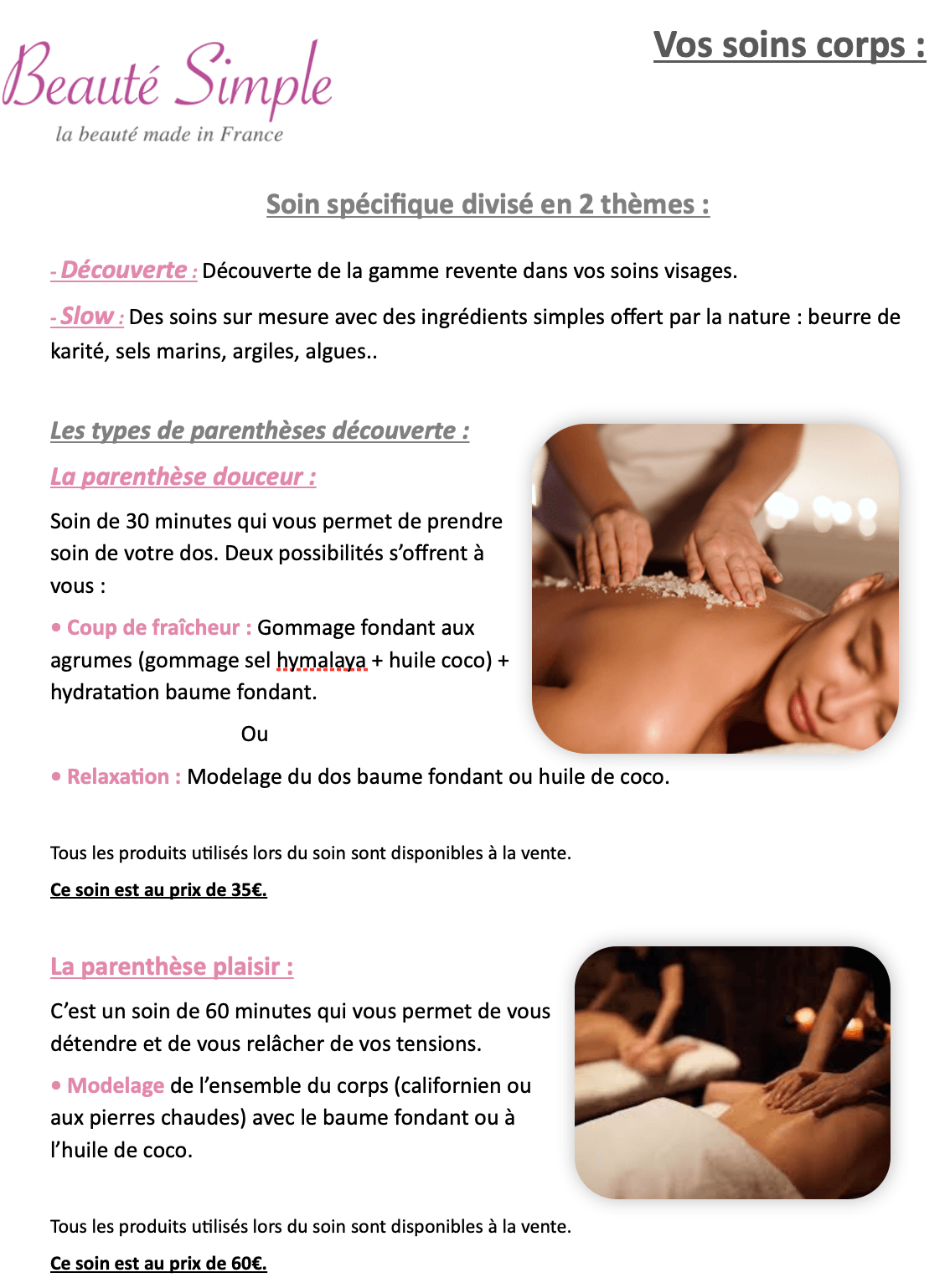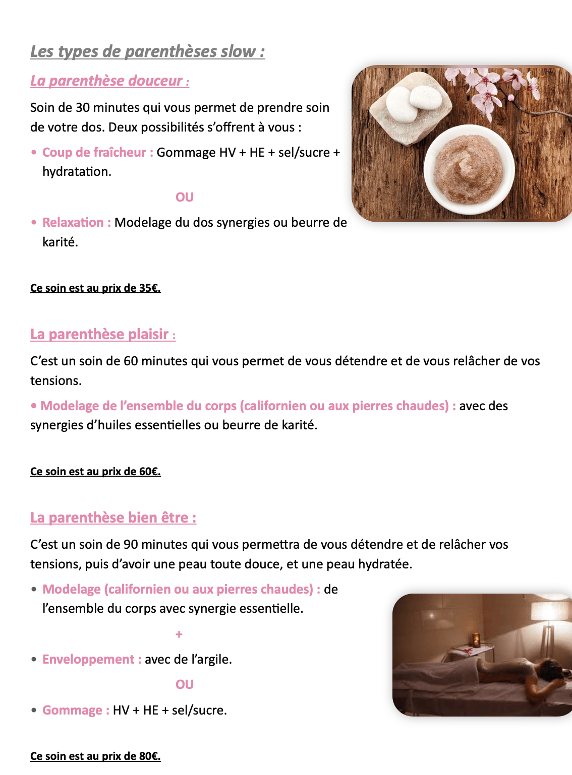 | Douceur 30 min | Gommage fondant aux agrumes + Hydratation Baume fondant OU Modelage du dos baume fondant OU Modelage californien face postérieure | Gommage HV+HE+sel/sucre + Hydratation OU Modelage du dos synergie essentielle ou beurre de karité OU Modelage californien face postérieure |