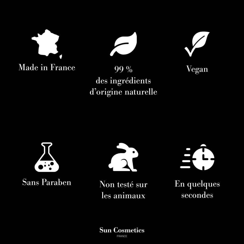 Une formule unique élaborée et fabriquée en France qui contient un activateur de mélanine et un actif hydratant pour un résultat adapté à chaque type de peau. 93% des ingrédients sont d’origine naturelle et sans paraben. Seules quelques secondes suffisent pour un visage et quelques minutes pour un corps complet.